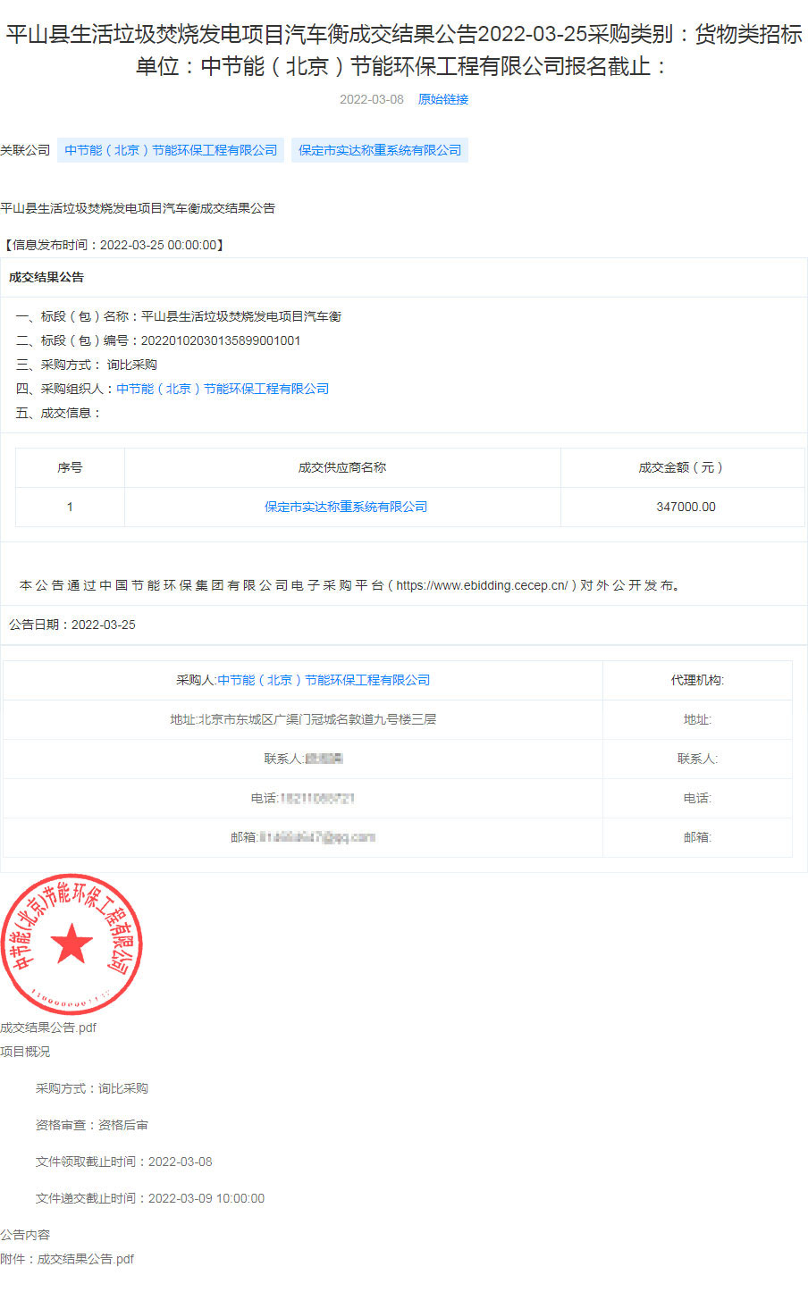 平山县生活垃圾焚烧发电项目汽车衡中标