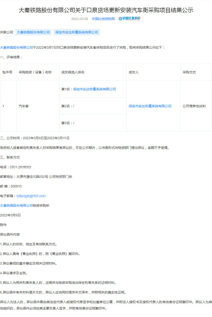 大秦铁路股份有限公司关于口泉货场更新安装汽车衡采购项目中标