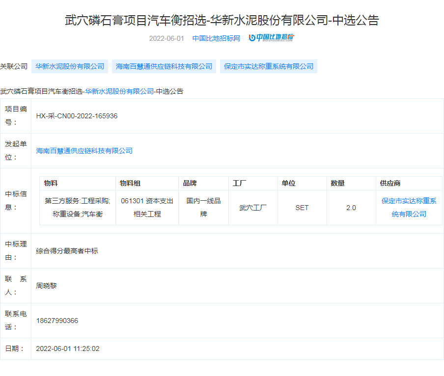 武穴磷石膏项目汽车衡招选-华新水泥股份有限公司-中选