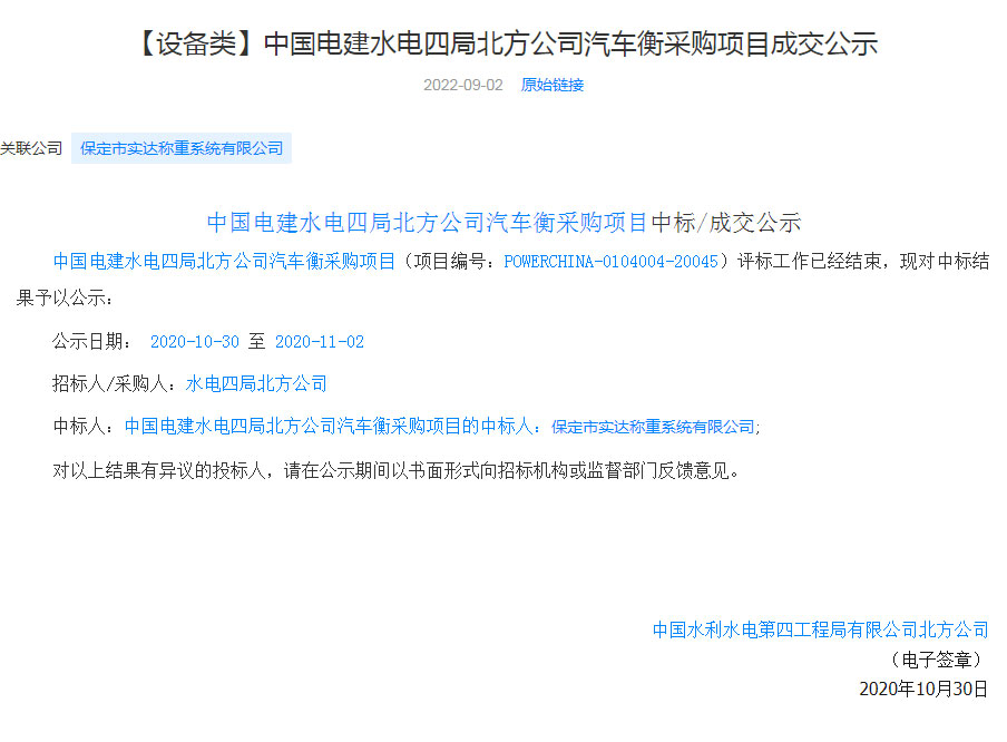 中国电建水电四局北方公司汽车衡采购项目中标
