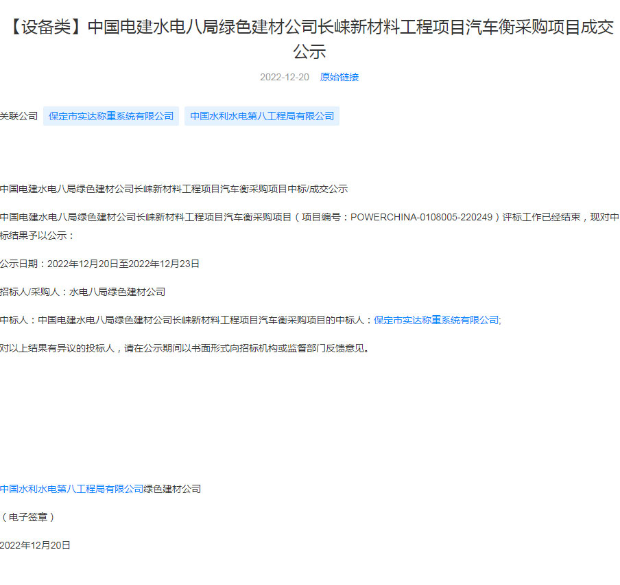 中国电建水电八局绿色建材公司长崃新材料工程项目汽车衡采购项目中标
