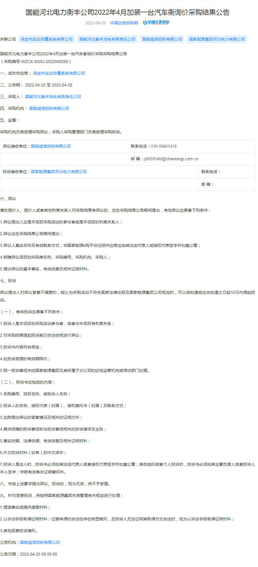 国能河北电力衡丰公司2022年4月加装一台汽车衡中标